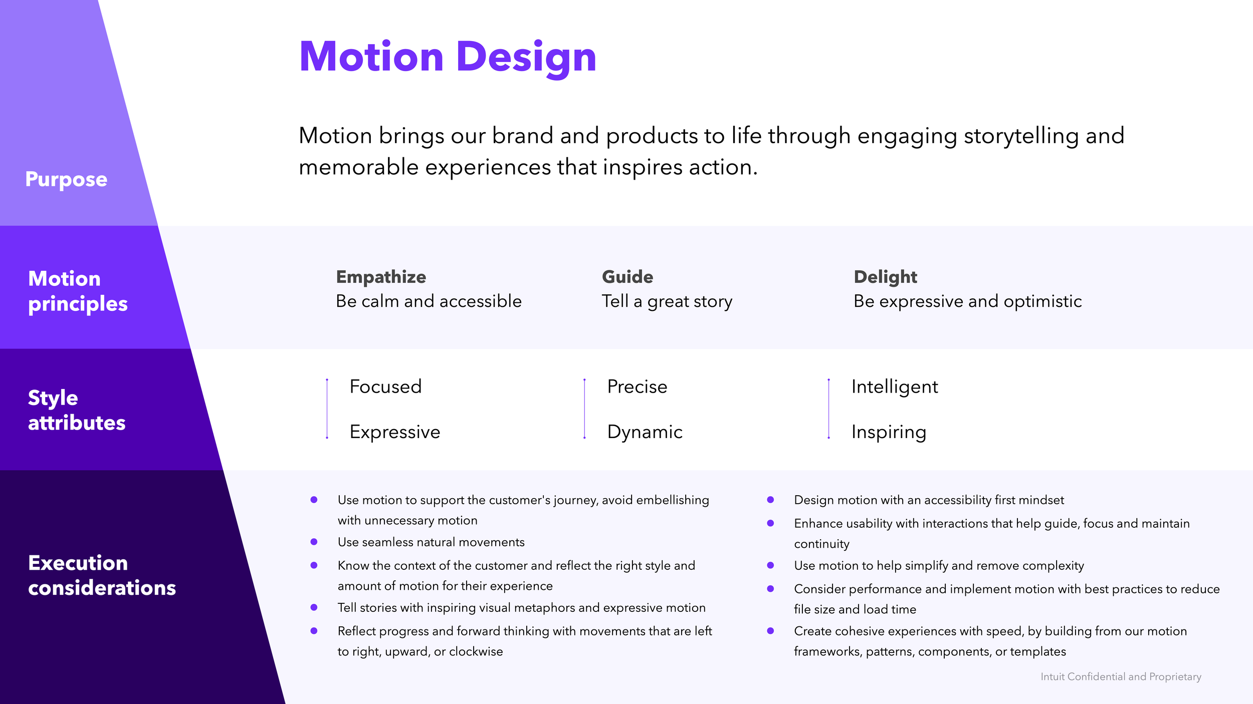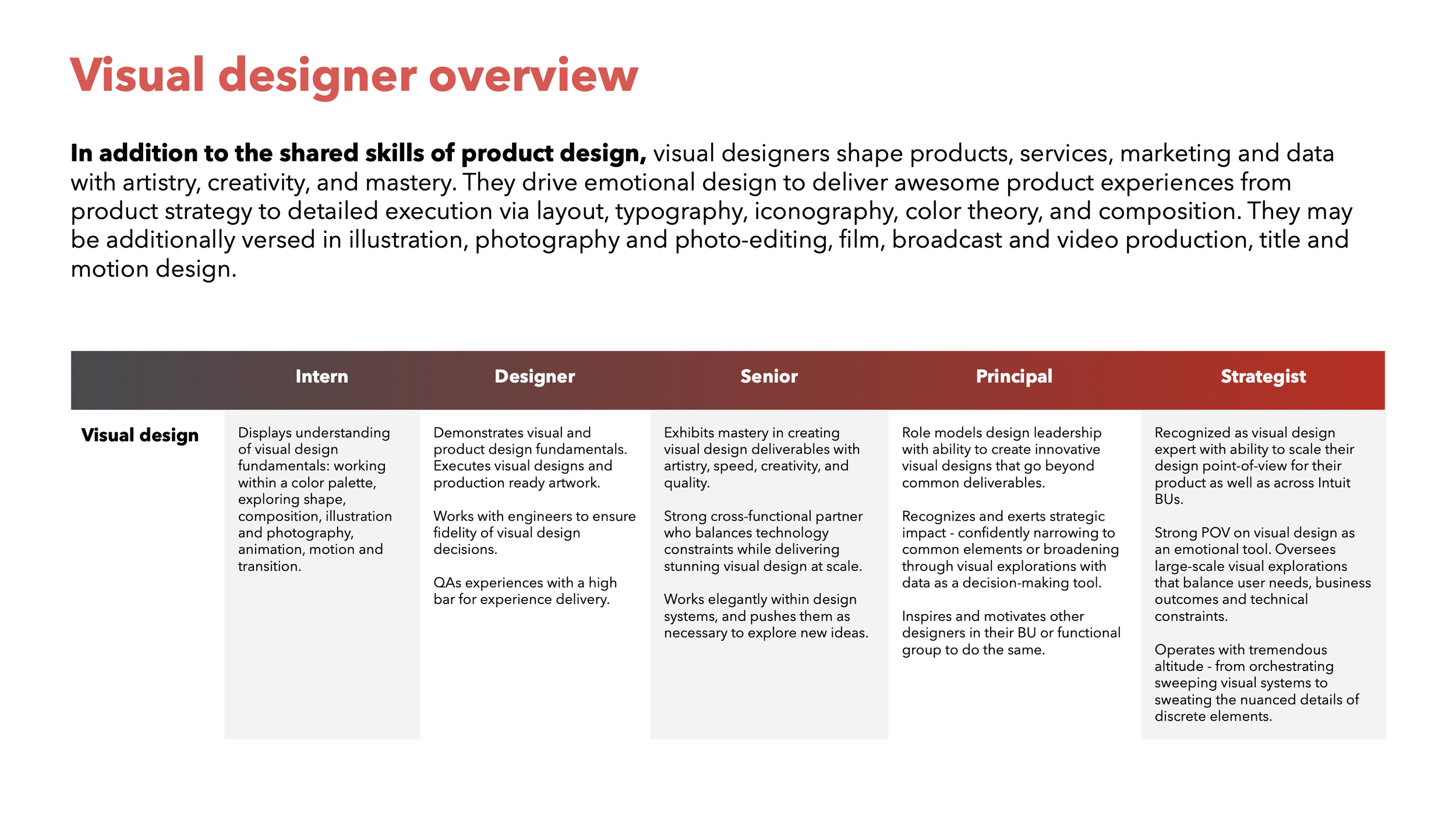 Objective: Redefine craft profiles and raise the bar for excellence within the Visual and Motion design craft family at Intuit. Establish centers of excellence for Visual and Motion, alongside Content, Research, Design Technology, and Design Operations.